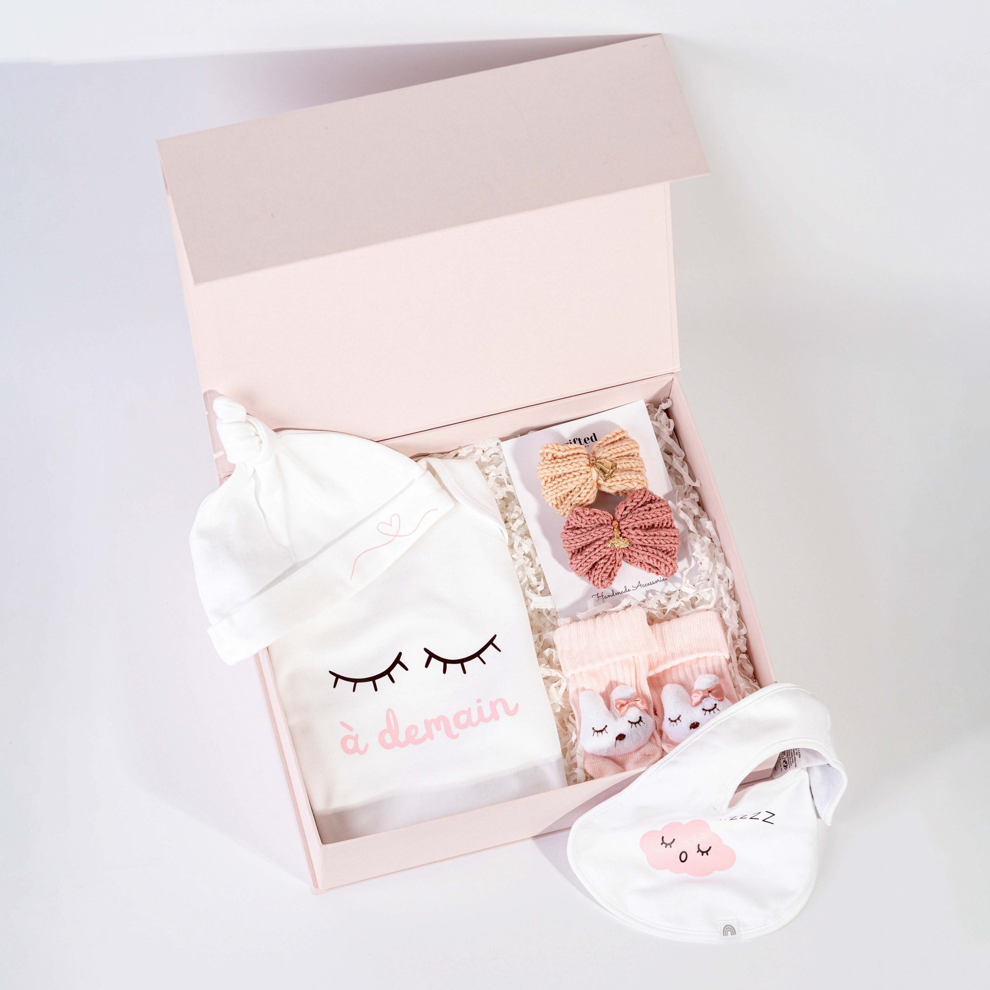 A soft pink magnetic gift box filled with cozy essentials for baby girl.